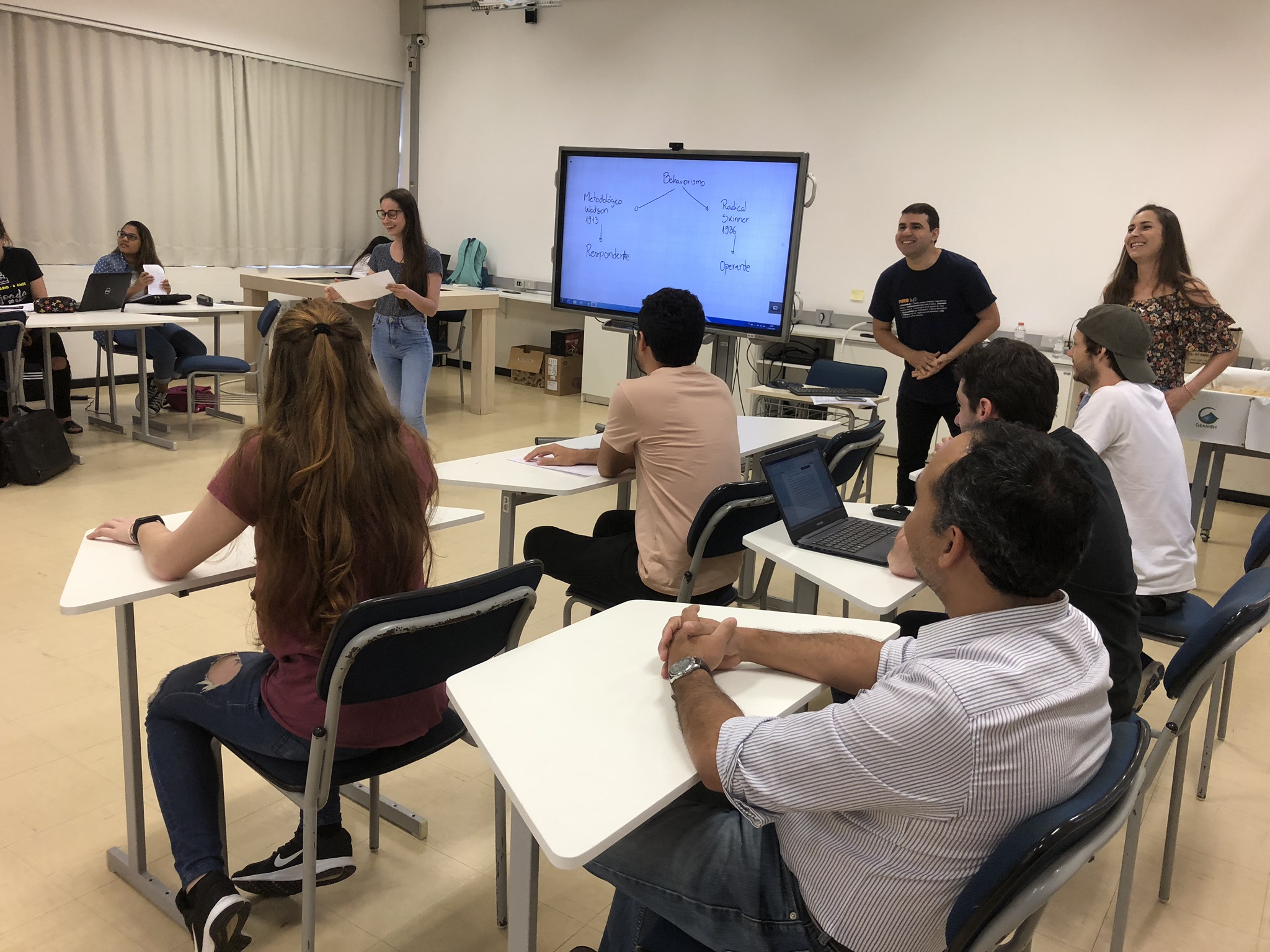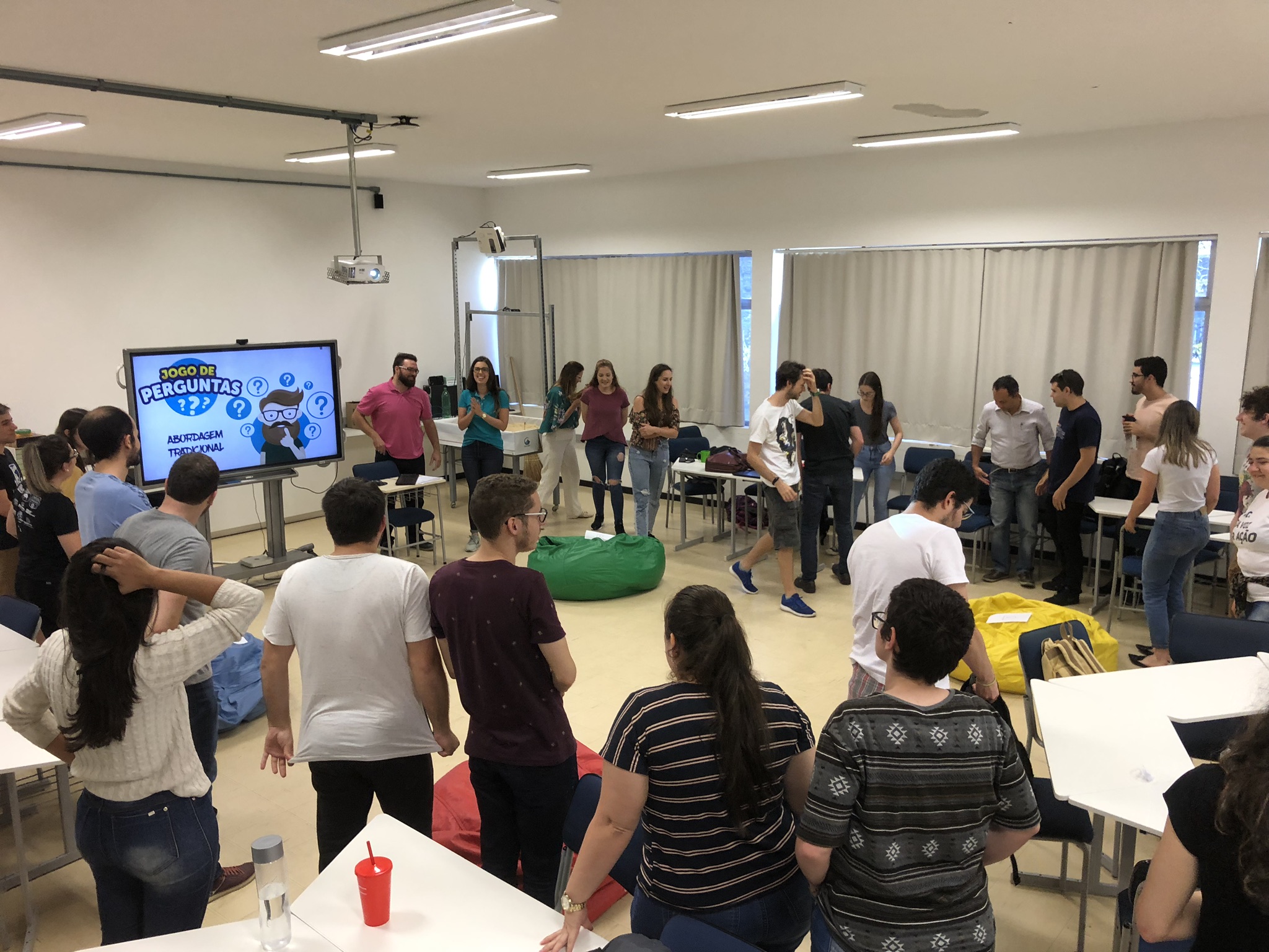 Foi bem legal ver como cada grupo resolveu abordar sua abordagem (haha) O grupo da abordagem tradicional trouxe um quiz onde, após escolhermos a reposta tínhamos que ir em direção do puff com a cor da resposta. O pessoal da abordagem comportamentalista fez um teatro pra gente, enquanto o grupo da abordagem-histórico cultural trouxe um gibi pra gente ler, e depois disso fizemos uma roda de conversa. Já o meu grupo (abordagem cognitiva) decidiu fazer a turma resolver um problema